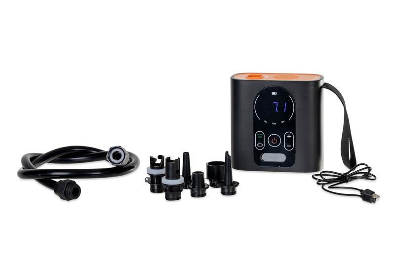 Die Luftpumpe mit 2.500 mAh Lithium-Akku erleichtert das Aufpumpen verschiedenster Produkte. Es ist v.a. für Luft-Zelte geeignet, aber auch Boote Kajaks, Möbel usw. bis zu max. 22 PSI. Die gewünschte Befüllung kann in PSI, BAR oder Kpa voreingestellt werden und wird auf dem LCD-Display angezeigt. Die Pumpe stoppt automatisch bei Erreichen des voreingestellten Drucks. Geliefert wird die Pumpe mit einem Schlauch und 6 verschiedenen Adaptern für alle gängigen Ventile.