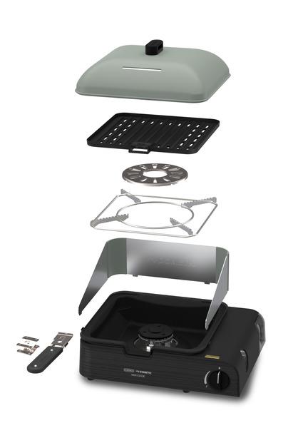 Inkl. Deckel, Topf- und Kaffeekannenständer, Grillplatte, Windschutz und Aufbewahrungstasche. Gewicht: ca. 4,5 kg