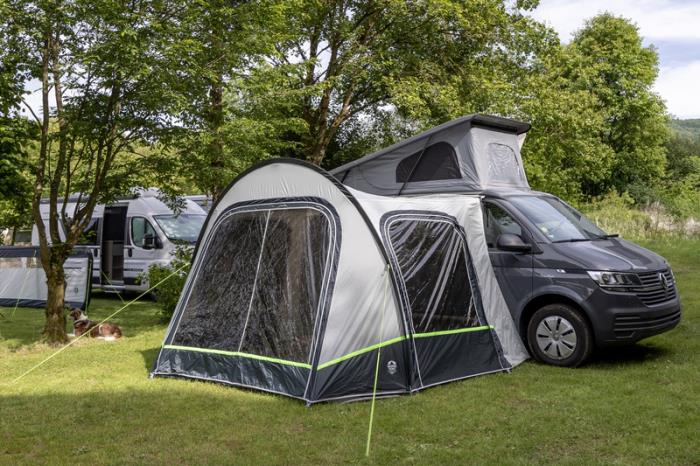 Multifunktionel markise/fortelt til autocampere med en rørskinne-længde fra 2,60 cm. Front- og sidesektionerne kan tages helt af og nemt opbevares i de indsyede lommer.