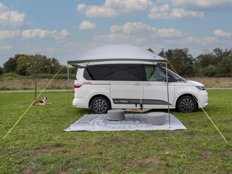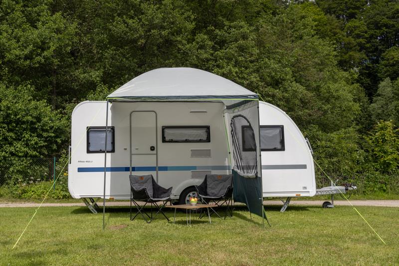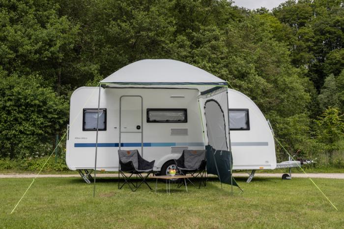 Stilfuld og robust markise til din campingvogn eller autocamper med påsyet rørprofil (Ø5+8 mm). De to medfølgende støttestænger og to diagonale glasfiberstænger sikrer, at solsejlet er stabilt buet opad. Dette forhindrer dannelsen af en vandlomme i det kuppelformede tag og sikrer en generøs følelse af plads og behagelig ståhøjde.