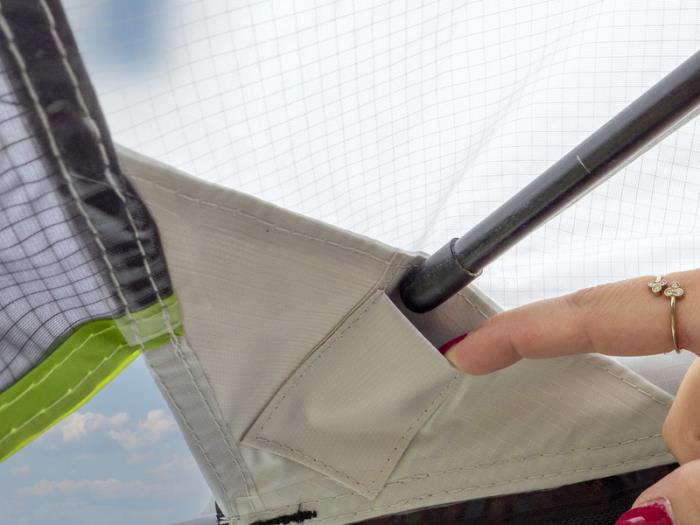 • Lommer med velcro i hjørnerne til nem indsættelse af glasfiberstængerne