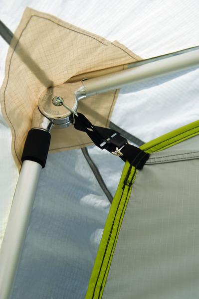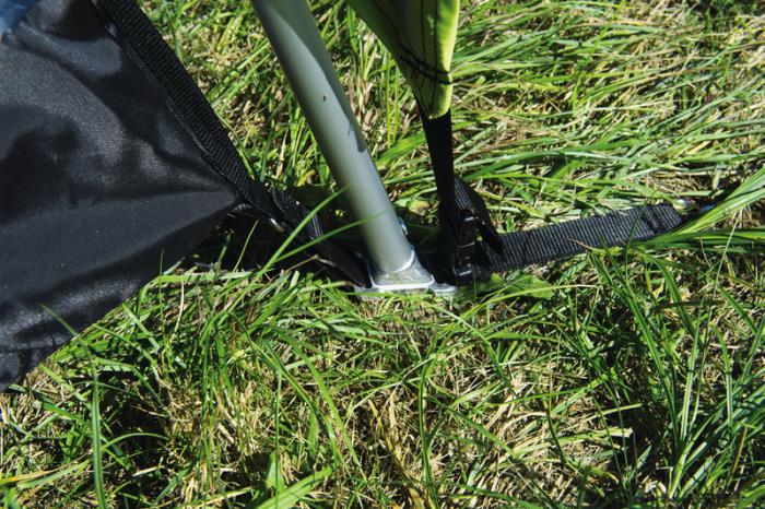 Gulvet er lavet af belagt 500D polyester, vandsøjletryk 4000mm. Sidevæggene og taget er lavet af flammehæmmende og belagt Ripstop Polyster 150T, vandsøjletryk 2000mm. Ramme: aluminiumstænger, Quick-system. Inklusiv sovekabine: 200x140cm (kan fastgøres til venstre eller højre), med myggenet dør.