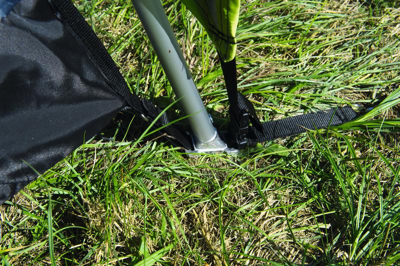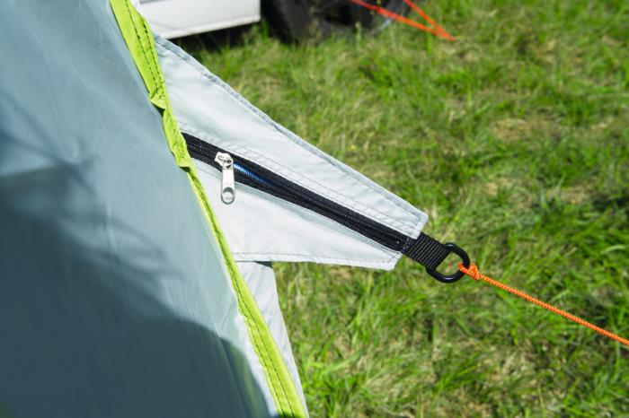 På bagvægen er der en stor dør med lynlås (dimensioner: B180xH170cm) * Til venstre og højre er der et PVC vindue (2/3 vindue og 1/3 myggenet for ventilation) som kan lynes op udefra * Teltet er fritstående/drive-away, derfor også brugbart uden et køretøj.