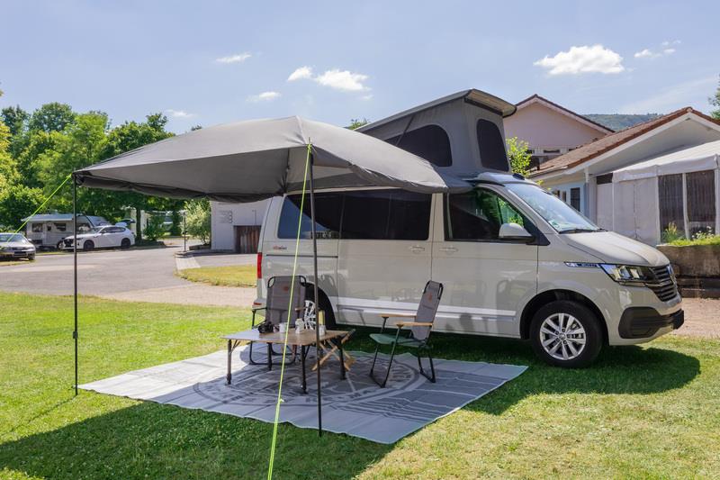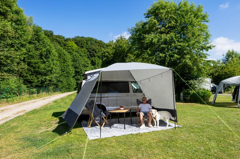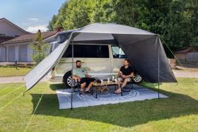 Elegant og robust solsejl i kraftig, ædel premiumkvalitet. Kuppeltaget med 2 diagonale stænger (glasfiber) giver en behagelig ståhøjde og forhindrer vandopsamling i regnvejr. De påsyede sidepaneler kan spændes eller rulles op efter ønske.