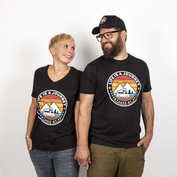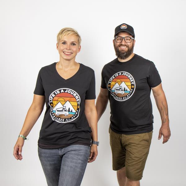 Komfortable T-shirts med V-hals til damer. Stort, farverigt emblemprint på brystet (Ø ca. 29 cm) og diskret logoprint i nakken.
